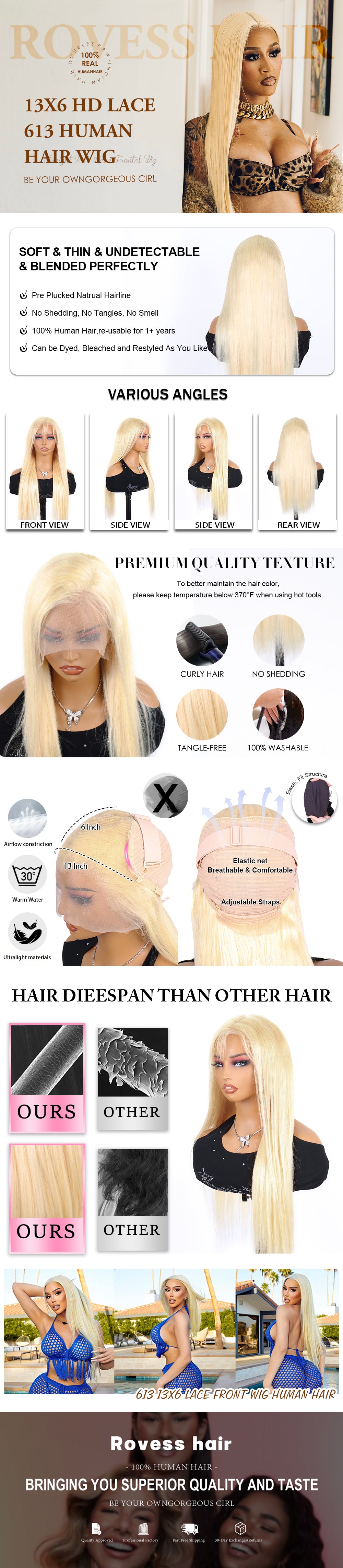• Material – 100% Unprocessed Brazilian Virgin Human Hair 613 Frontal Wig, The Hair Cut From Young Donor, Soft And Natural, Healthy And Vibrant, No Shedding And Tangle Free.