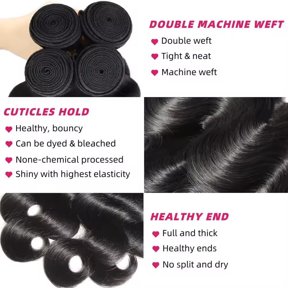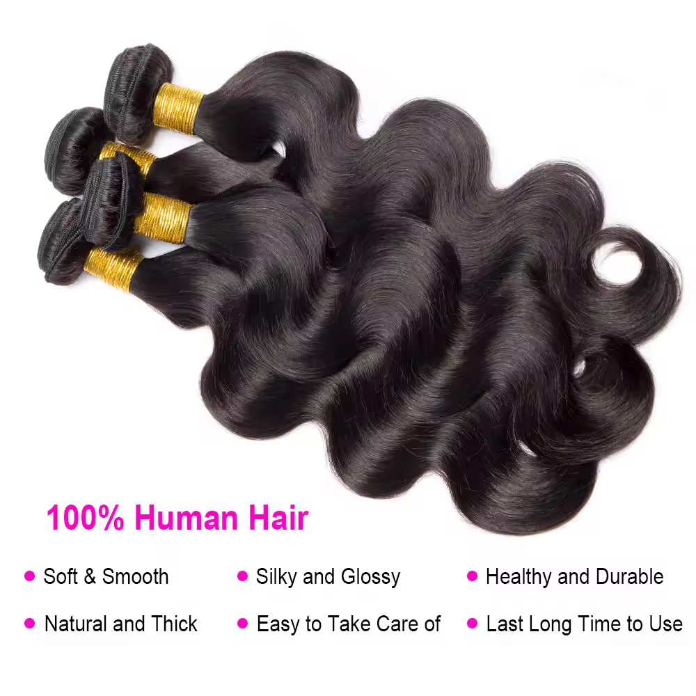 16-30 Inch Luxury Natural Black Body Wave Bundles – 100% Virgin Brazilian Human Hair, 4 Bundles | FREE Gifts: 16" Lace Closure, Wig Cap & Baby Hair 🎁