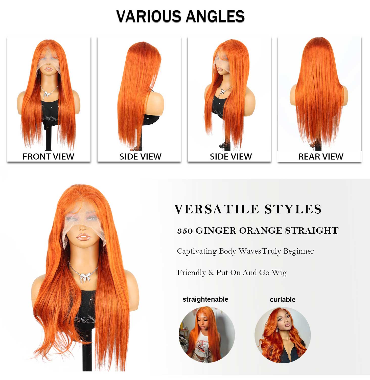 Straight Orange Ginger Lace Front Wigs Human Hair 350 Colored Brazilian 24-36 Inch 13X4 HD Lace Frontal Wigs Pre Plucked