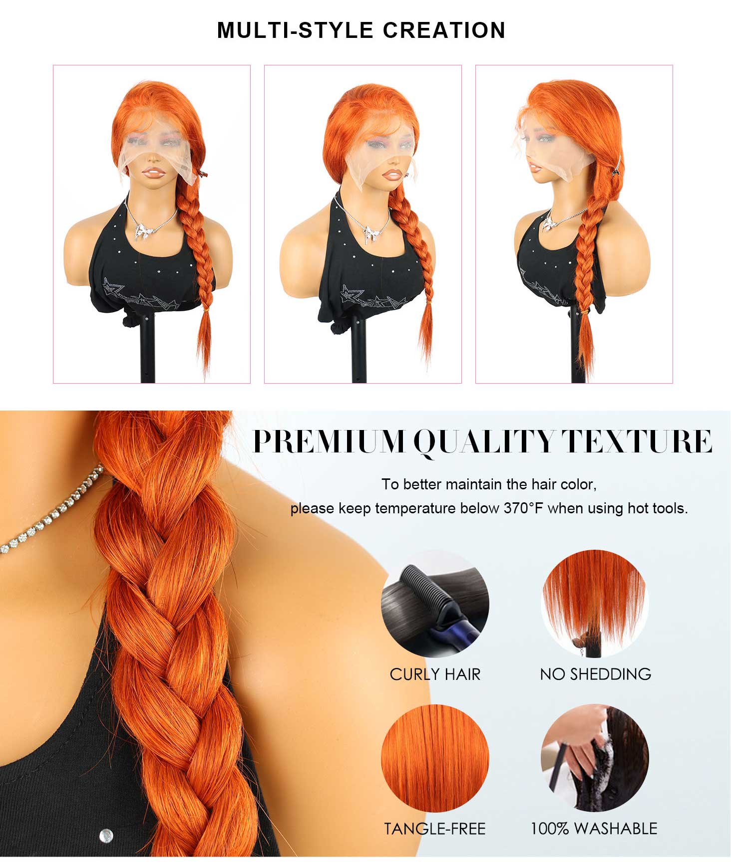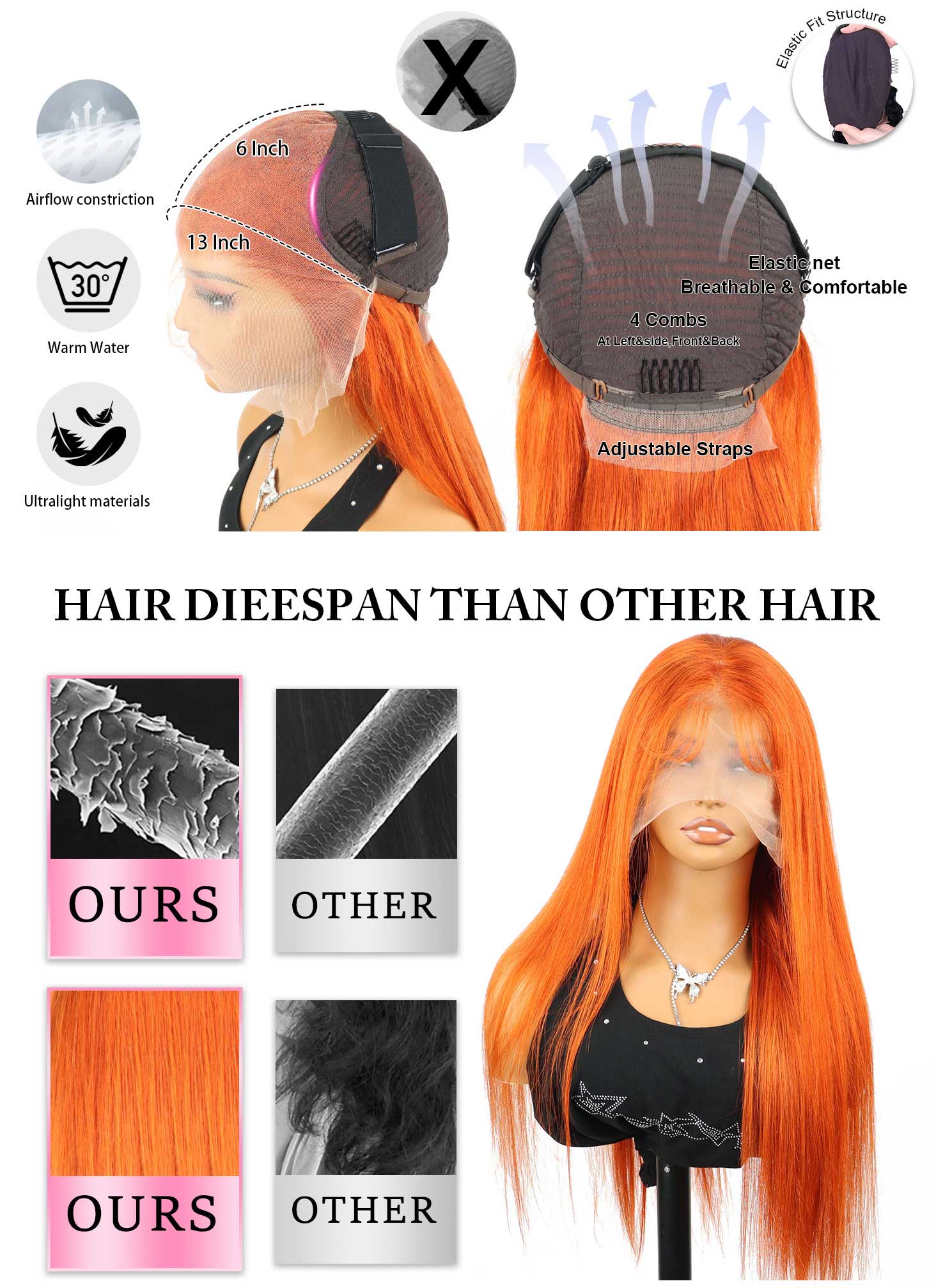 Ginger Orange Lace Front Wig Human Hair Material: 100% Unprocessed Brazilian Virgin Human Hair Lace Front Wig, From Healthy Young Girl Head. Natural, Healthy, Smooth, and Silky.